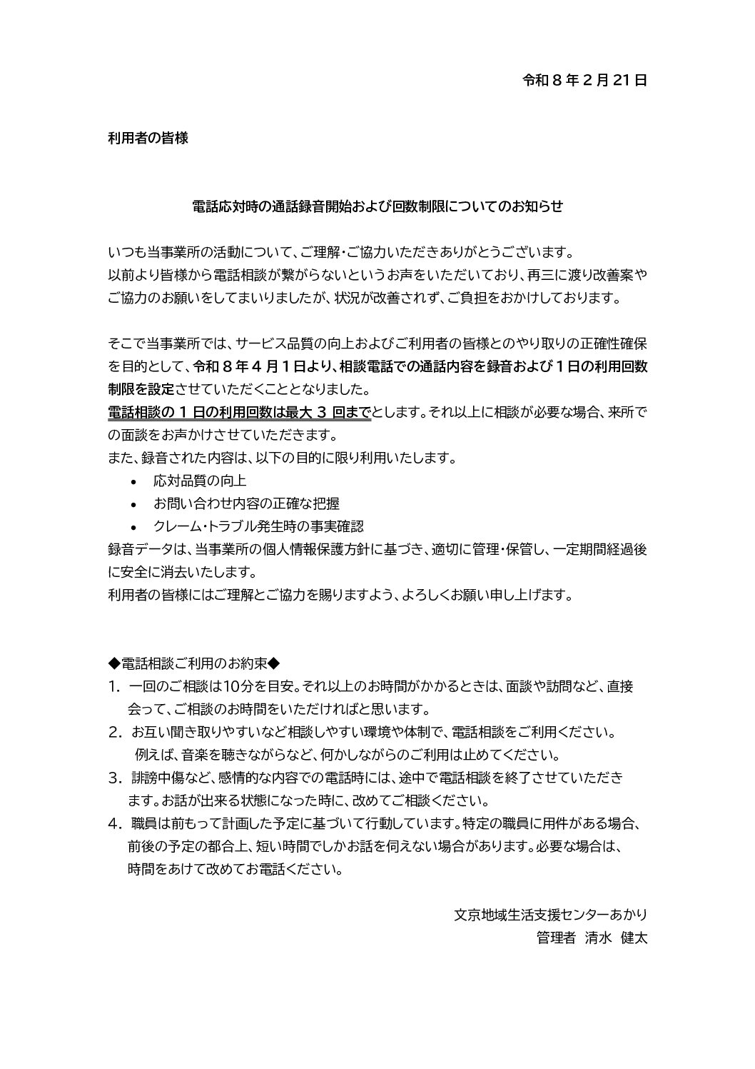 支援センターあかりの相談電話は、システム変更に伴い、令和8年4月1日(水)より、電話をかけた際に以下に記載されているアナウンスが流れるようになります。アナウンス終了後に、これまで通り相談電話に繋がりますので、ご了承ください。